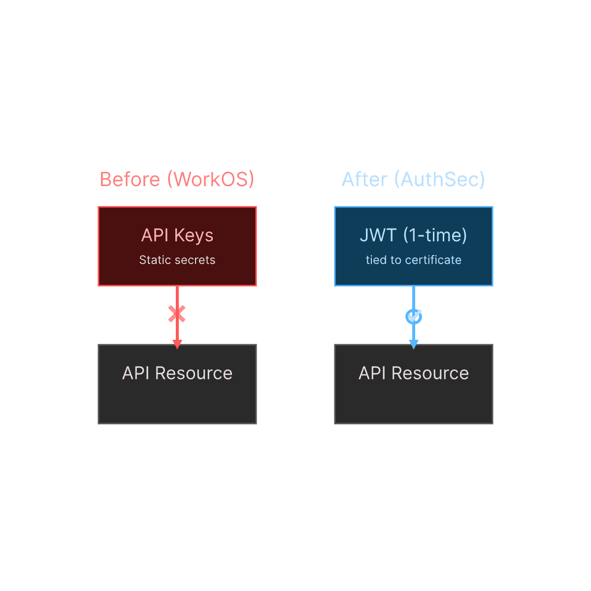 AuthSec eliminates API keys entirely. Each request is verified through a short-lived, one-time JWT tied to a workload certificate.