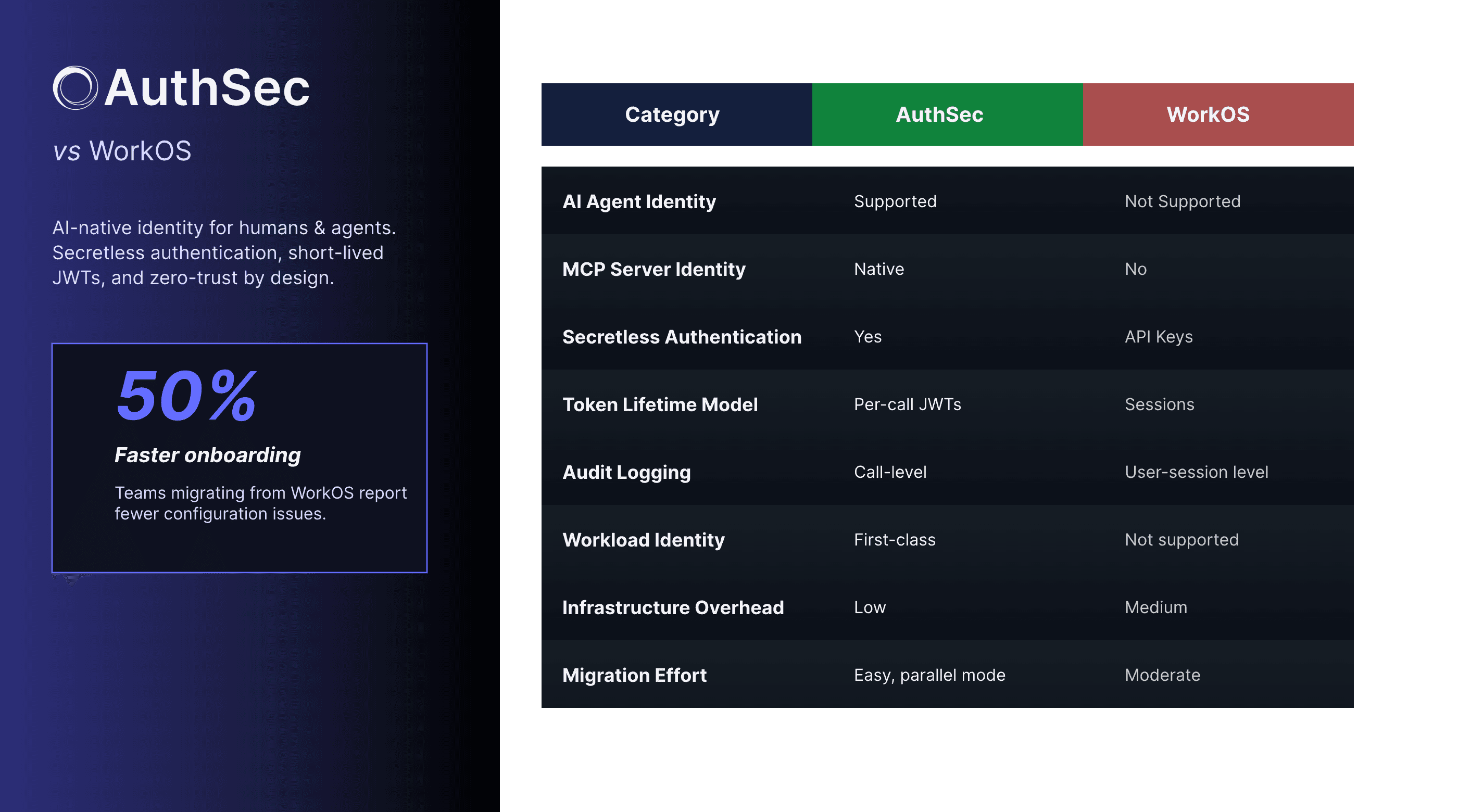 AuthSec provides first-class identity for non-human entities — AI agents, automation bots, orchestration layers, and MCP servers — each with scoped, short-lived access. WorkOS only models human identities.